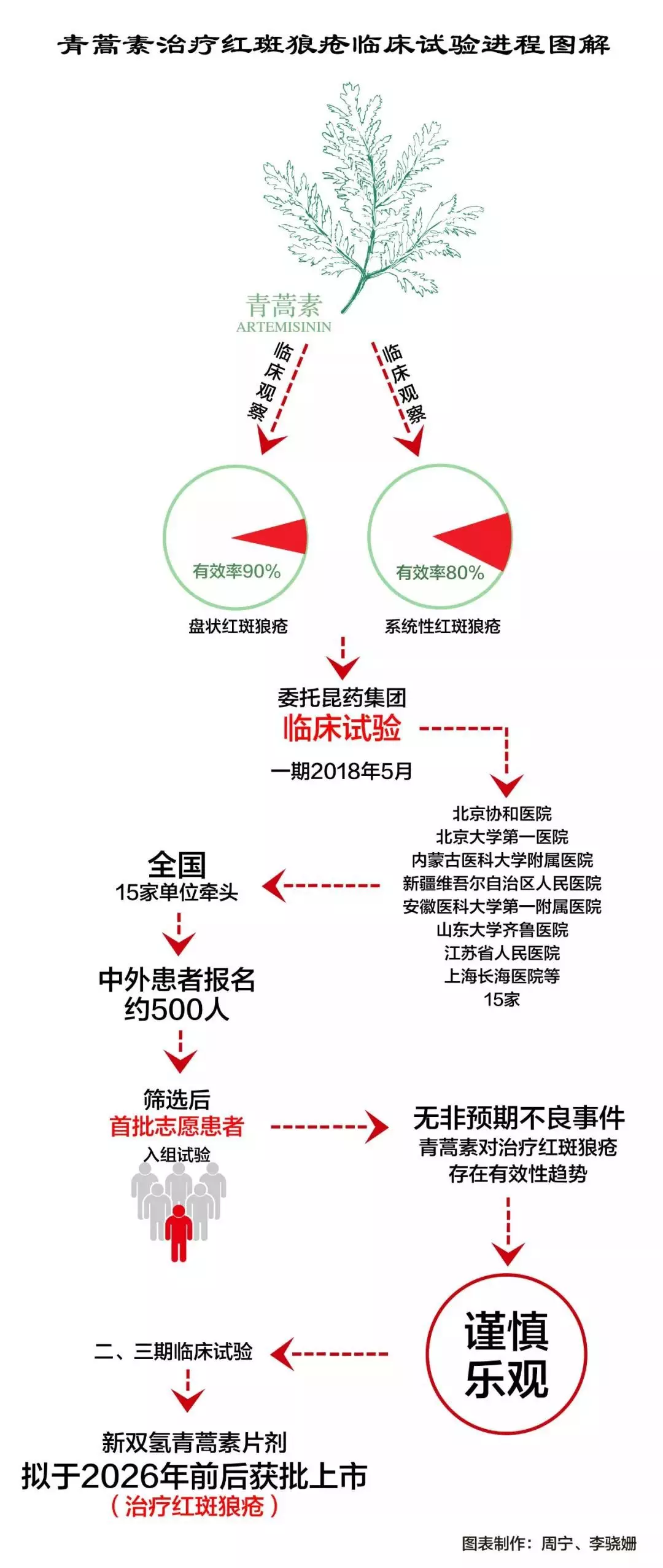 根據(jù)國家藥品監(jiān)督管理局《藥物臨床試驗批件》顯示,由屠呦呦團隊所在的中國中醫(yī)科學院中藥研究所提交的“雙氫青蒿素片劑治療系統(tǒng)性紅斑狼瘡、盤狀系統(tǒng)性紅斑狼瘡的適應癥臨床試驗”申請已獲批準。昆藥集團股份有限公司作為負責單位開展臨床試驗。
