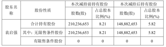 公司股東袁啟強(qiáng)先生持有公司股份210,236,653股,占公司總股本比例8.21%。截止目前,袁啟強(qiáng)先生共減持公司股份6,135.40萬股,減持公司股份數(shù)量較其預(yù)披露減持計(jì)劃數(shù)量已過半。具體減持情況如下: