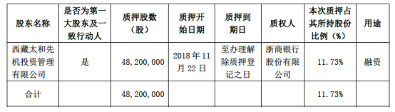 2018年11月22日,太和先機(jī)將其持有的4,820萬股股份質(zhì)押給浙商銀行股份有限公司。質(zhì)押情況如下: