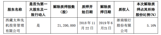今日,公司將上述質(zhì)押給浙商銀行股份有限公司的股份中的2,120萬股股份辦理了股票質(zhì)押購回交易,并辦理了股票質(zhì)押解除登記手續(xù),具體情況如下: