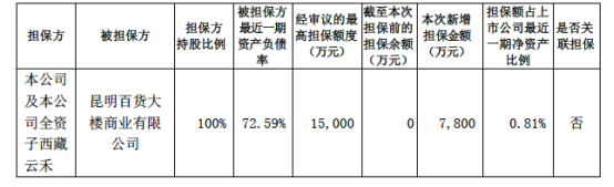 公司根據(jù)子公司昆明百貨大樓商業(yè)有限公司經(jīng)營業(yè)務(wù)開展的資金需求,公司可為商業(yè)公司提供擔(dān)保額度為15,000萬元。