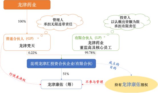 龍津匯注冊資本1,361萬元,其中,龍津梵天出資3萬元出任普通合伙人(GP),龍津藥業(yè)董監(jiān)高出資722萬元、27名核心員工出資636萬元,雙方合計出資1,358萬元擔(dān)任該有限合伙企業(yè)的有限合伙人(LP)。