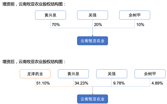 本周,龍津藥業(yè)向云南牧亞農(nóng)業(yè)支付增資款800萬元,并正式取得了該公司51.1%的股權(quán)。