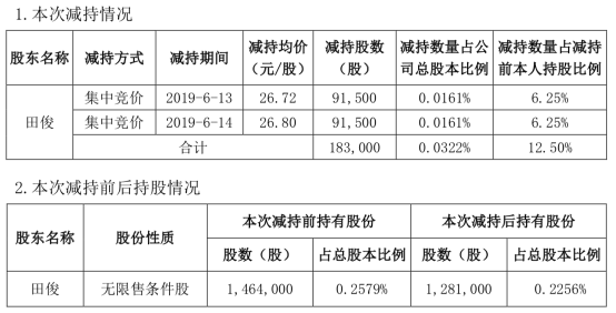 一心堂董事兼 副總裁、董事會秘書、財務(wù)負(fù)責(zé)人田俊先生計劃以集中競價的方式減持公司股份不超過 183,000 股,并于6月13至14日,分2次完成本輪減持工作: