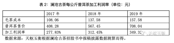 瀾滄古茶招股說明書申報稿亦披露:2017年-2019年,公司毛茶原料總采購金額分別為11,032.39萬元、13,750.35萬元、12,755.67萬元,每公斤的采購價格分別為108.06元、137.58元、157.58元,呈逐年上升的趨勢。根據(jù)其招股書申報稿數(shù)據(jù)測算,將每公斤毛茶采購成本和普洱茶銷售單價作對比,可以看出瀾滄古茶的加工利潤率高的驚人且不斷上漲,這真的合理嗎?