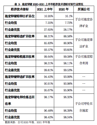 經(jīng)濟(jì)技術(shù)指標(biāo)方面:對標(biāo)行業(yè),馳宏鋅鍺在鉛鋅礦品位、鉛鋅選礦回收率等經(jīng)濟(jì)技術(shù)指標(biāo)均高于行業(yè)平均水平,且與行業(yè)最優(yōu)值差距較小。2020-2021上半年,馳宏鋅鍺各項(xiàng)經(jīng)濟(jì)技術(shù)指標(biāo)及對標(biāo)行業(yè)情況如下表所示:
