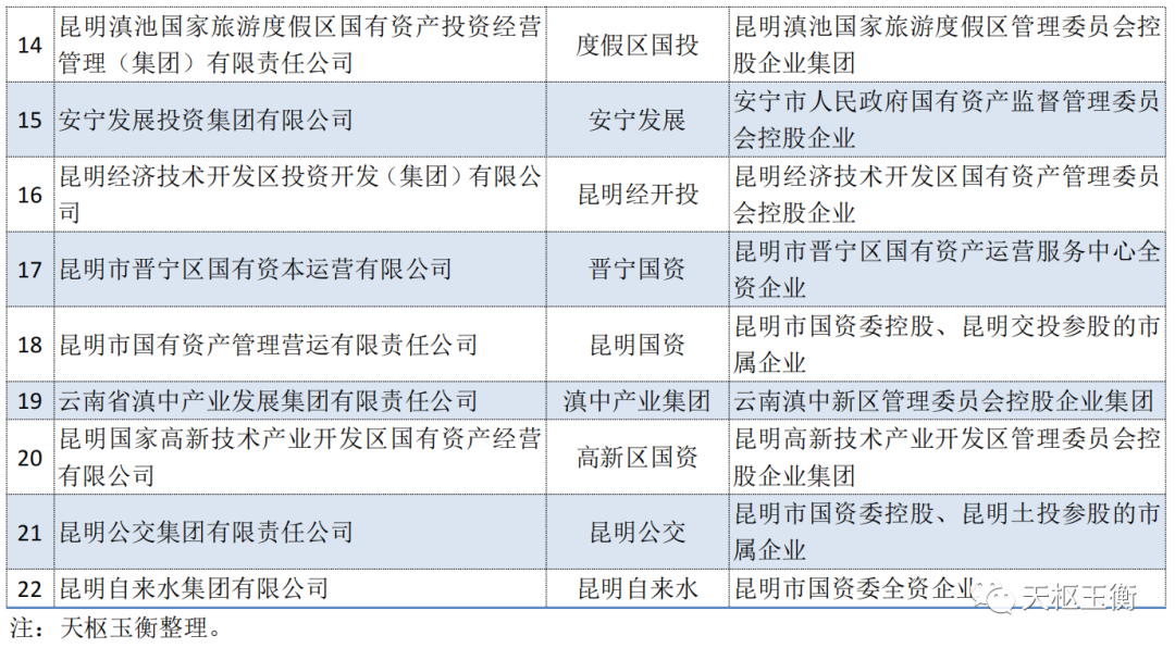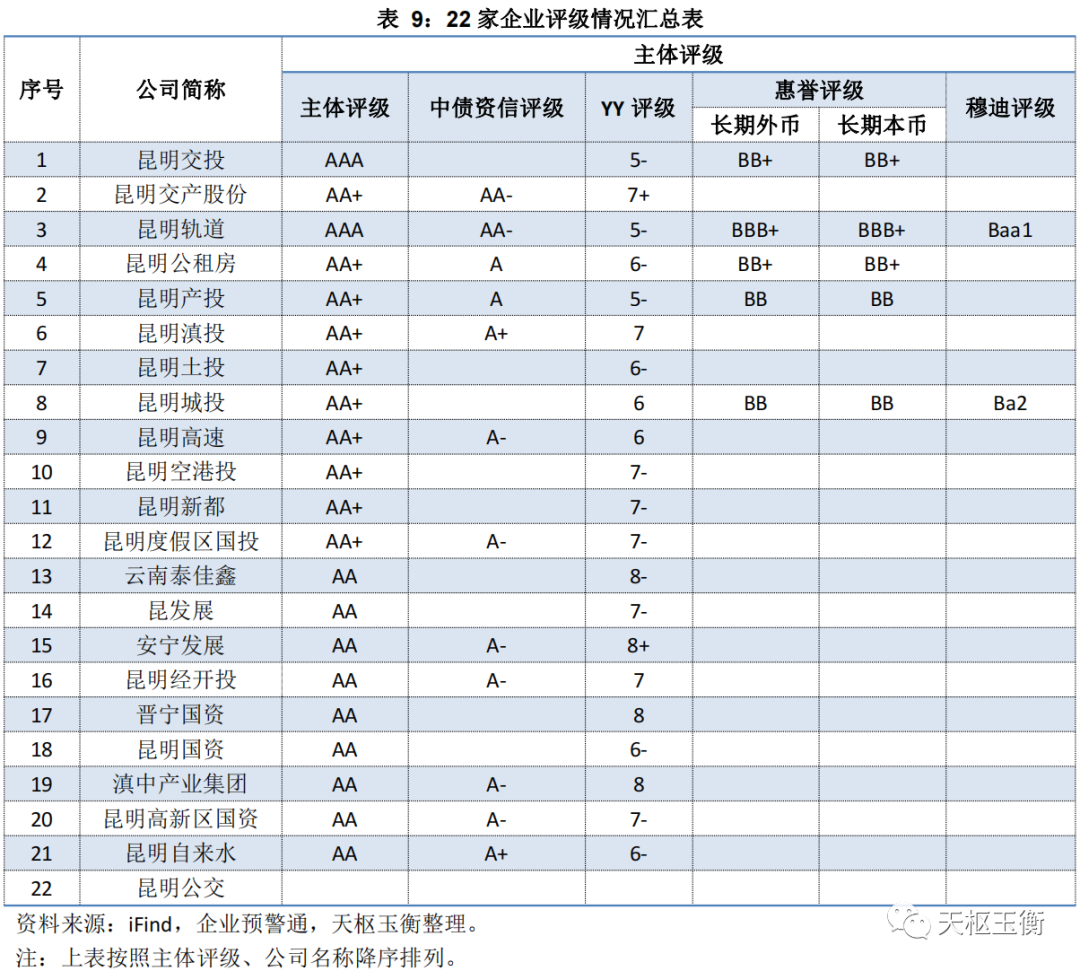 昆明產(chǎn)投、昆明交產(chǎn)股份、昆明公租房、昆明滇投、昆明土投、昆明城投、昆明高速、昆明空港投、昆明新都、昆明度假區(qū)國投均取得了AA+的主體評(píng)級(jí),評(píng)級(jí)展望均為“穩(wěn)定”。