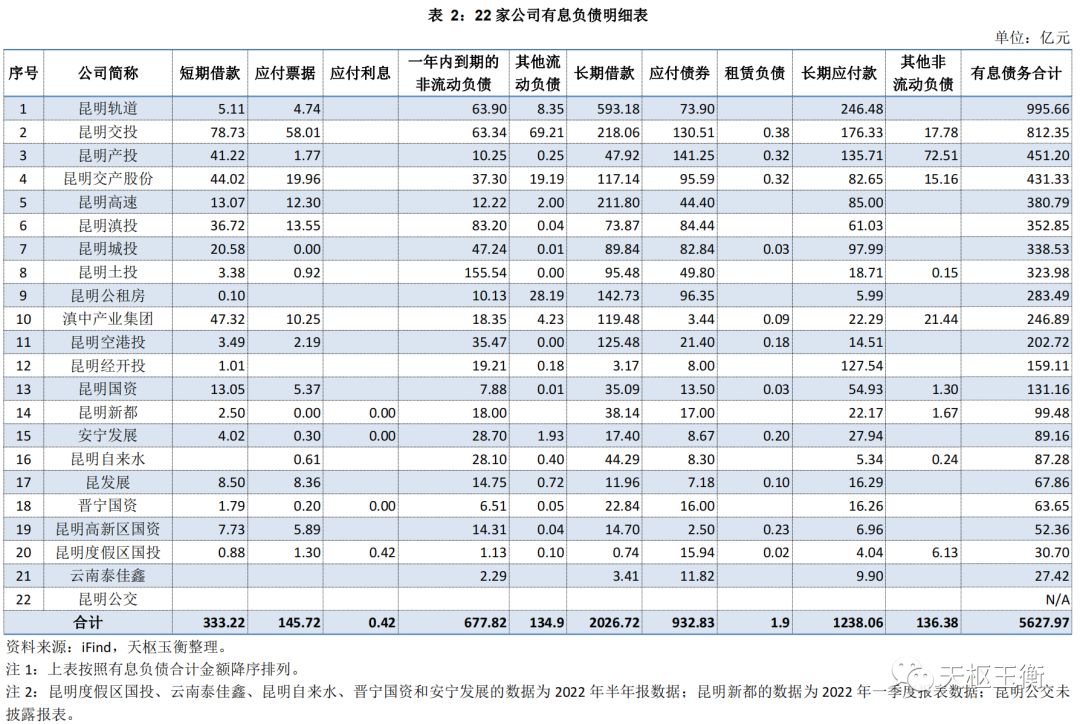 這22家企業(yè)在,有息債務(wù)最高的是昆明軌道,其有息債務(wù)合計(jì)996億元;其次是昆明交投,有息債務(wù)合計(jì)812億元,第三是昆明產(chǎn)投451億元,第4-第10則分別是昆明交產(chǎn)股份431億元,昆明高速381億元,昆明滇投353億元,昆明城投324億元,昆明土投323億元,昆明公租房283億元,滇中產(chǎn)業(yè)集團(tuán)247億元。