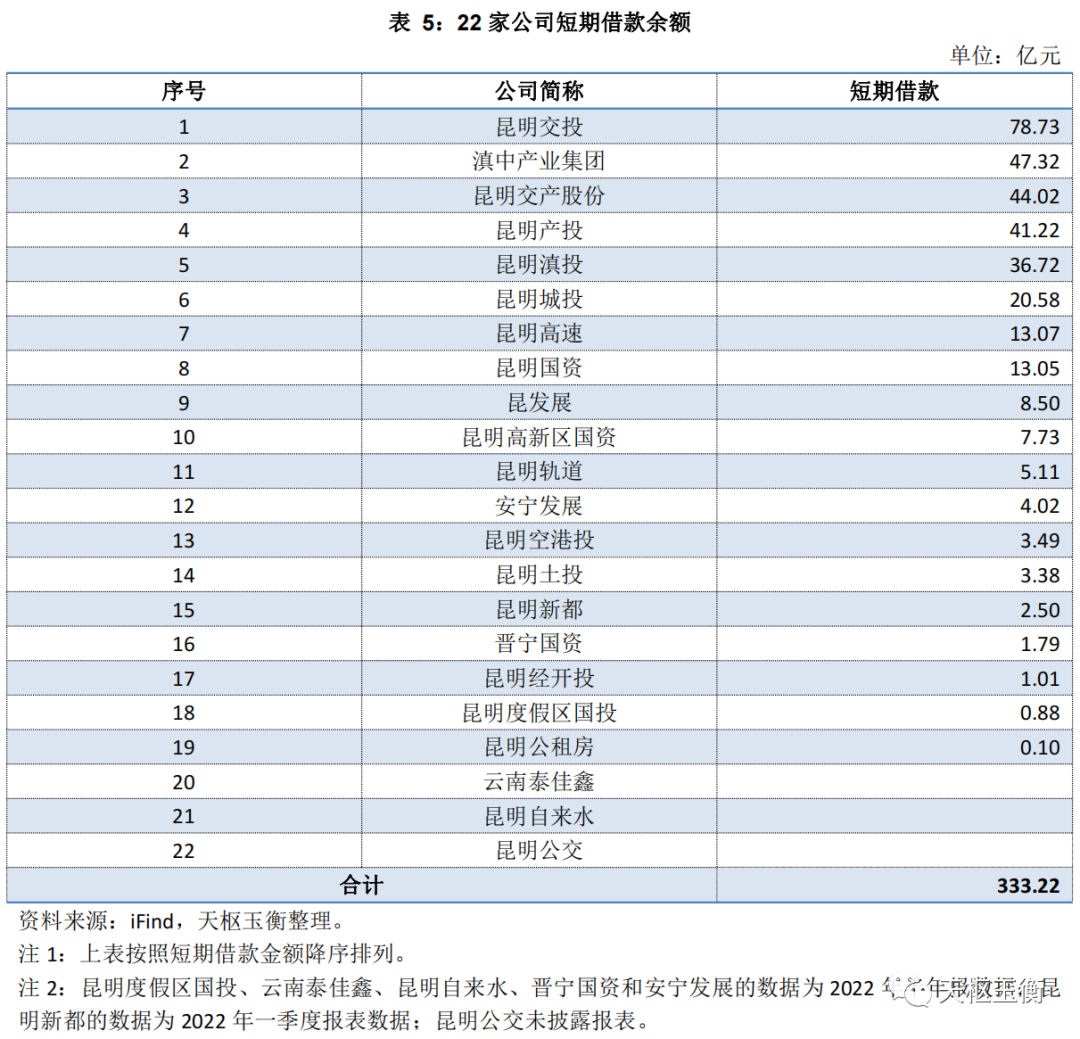 這22家企業(yè)短期借款余額合計(jì)333億元,票據(jù)融資余額146億元,一年內(nèi)到期的非流動(dòng)負(fù)債余額合計(jì)678億元,長期借款余額合計(jì)2,027億元。短期借款余額方面,昆明交投余額79億元排第一,第2-5名分別是滇中產(chǎn)業(yè)集團(tuán)47億元,昆明交產(chǎn)股份44億元,昆明產(chǎn)投41億元,昆明滇投37億元;
