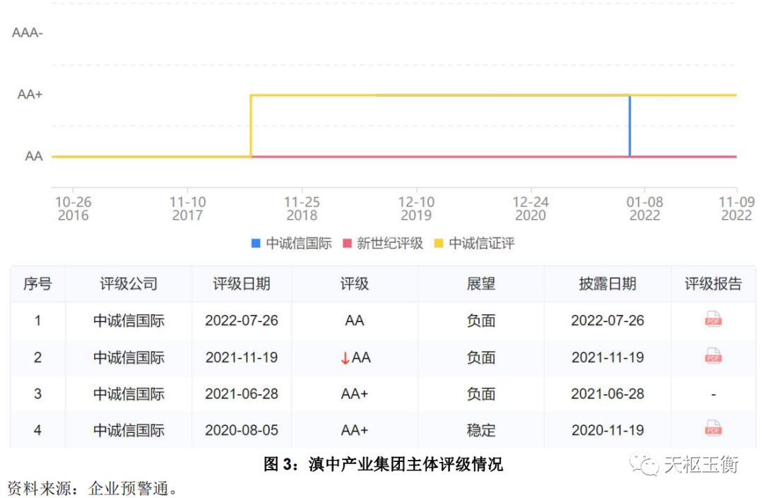 根據(jù)惠譽(yù)最新評(píng)級(jí)報(bào)告顯示:昆明軌道獲得惠譽(yù)長期本幣、長期外幣BBB+評(píng)級(jí),但評(píng)級(jí)展望為負(fù)面;昆明交投的惠譽(yù)長期本幣、長期外幣于2021年6月由BBB-下調(diào)至BB+,評(píng)級(jí)展望為穩(wěn)定;昆明公租房的惠譽(yù)長期本幣、長期外幣為BB+,但評(píng)級(jí)展望為負(fù)面;昆明產(chǎn)投的惠譽(yù)長期本幣、長期外幣于2022年8月由BB+下調(diào)至BB,評(píng)級(jí)展望為穩(wěn)定;昆明城投的惠譽(yù)長期本幣、長期外幣于2021年9月由BB+下調(diào)至BB,評(píng)級(jí)展望為穩(wěn)定。