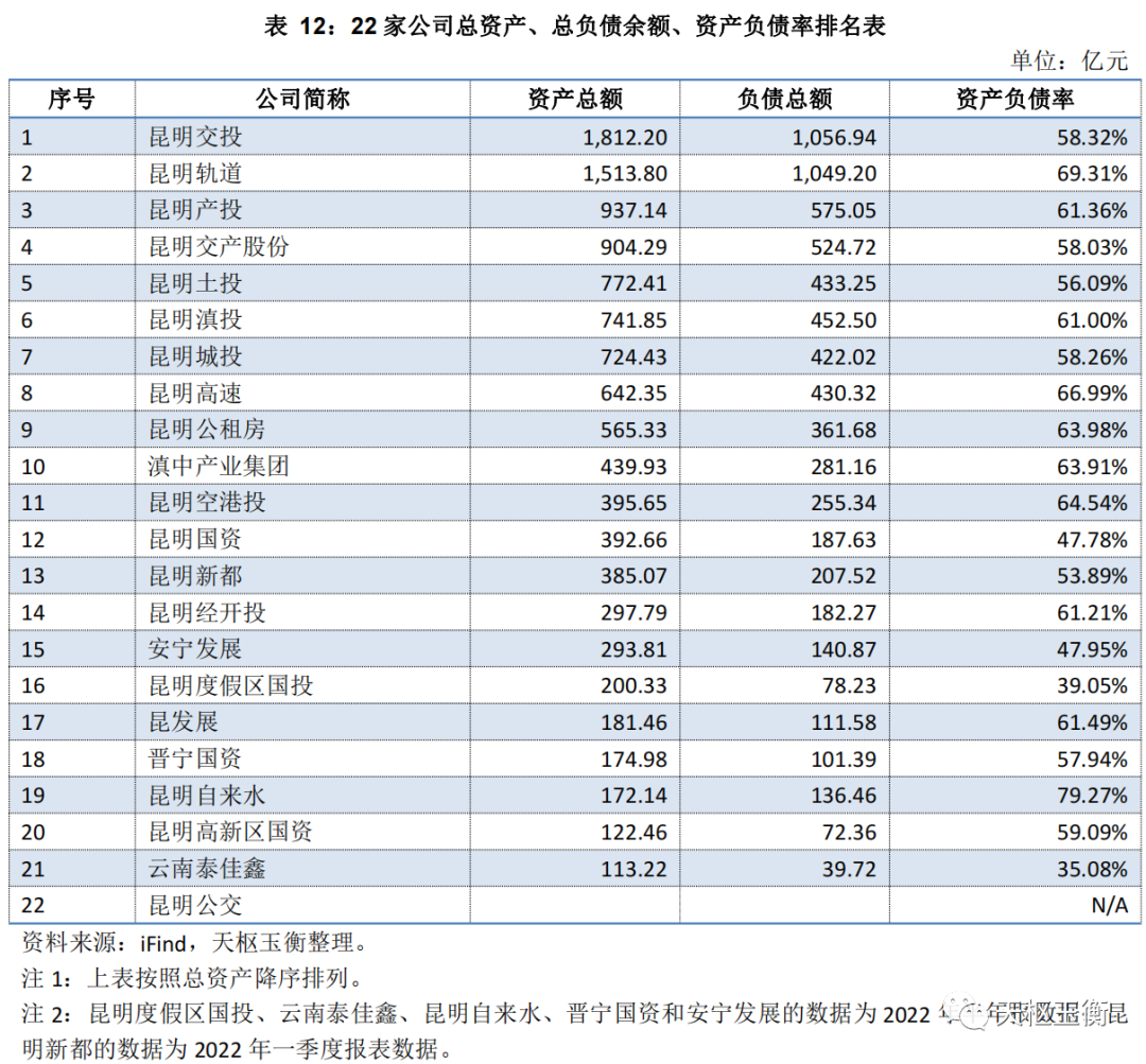 截至2022年10月31日,有22家昆明市及所屬縣區(qū)與滇中新區(qū)等的投融資公司(含公用事業(yè)企業(yè),具體名單見表1)有公開市場(chǎng)融資而披露了他們2022年的三季報(bào),我們也根據(jù)iFind系統(tǒng)等的查詢,簡(jiǎn)要分析它們的債務(wù)情況。