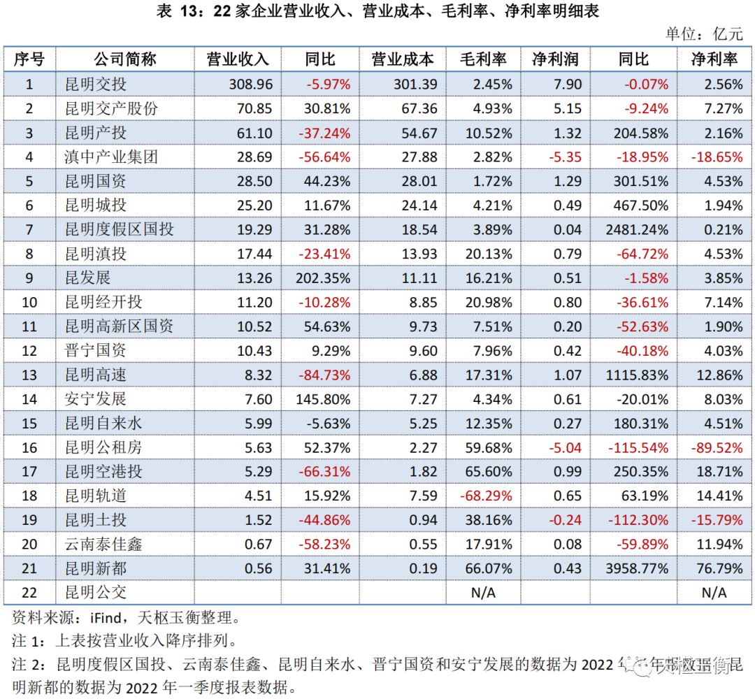 這22家公司營業(yè)收入合計(jì)高達(dá)645億元,其中昆交投309億元排第一,遠(yuǎn)高于第2-10位;它們是交產(chǎn)股份71億元,昆明產(chǎn)投61億元,滇中產(chǎn)業(yè)集團(tuán)28億元,昆明城投28億元,度假區(qū)國投19億元,昆明滇投17億元,經(jīng)開投14億元,昆發(fā)展11億元。
