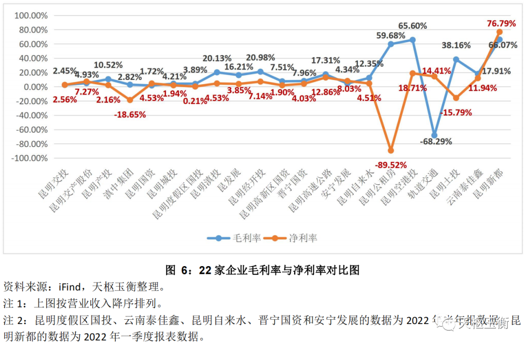 3. 22家企業(yè)中,3家企業(yè)的凈利潤為負(fù),滇中產(chǎn)業(yè)集團(tuán)在2022年三季度虧損5.35億元排名第一,昆明公租房虧損5.04億元排名第二,昆明土投虧損0.24億元排名第三。