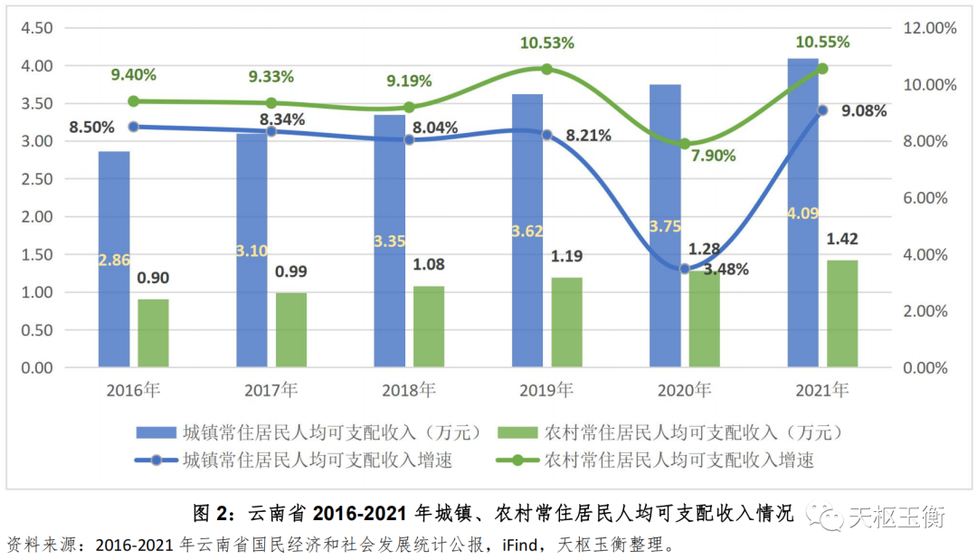 在居民收入方面,近三年云南省城鎮(zhèn)常住居民人均可支配收入增速有所波動,但2021年規(guī)模跨過4萬元;農(nóng)村常住居民人均可支配收入增速相對較高,2019年、2021年增速均在10%以上。
