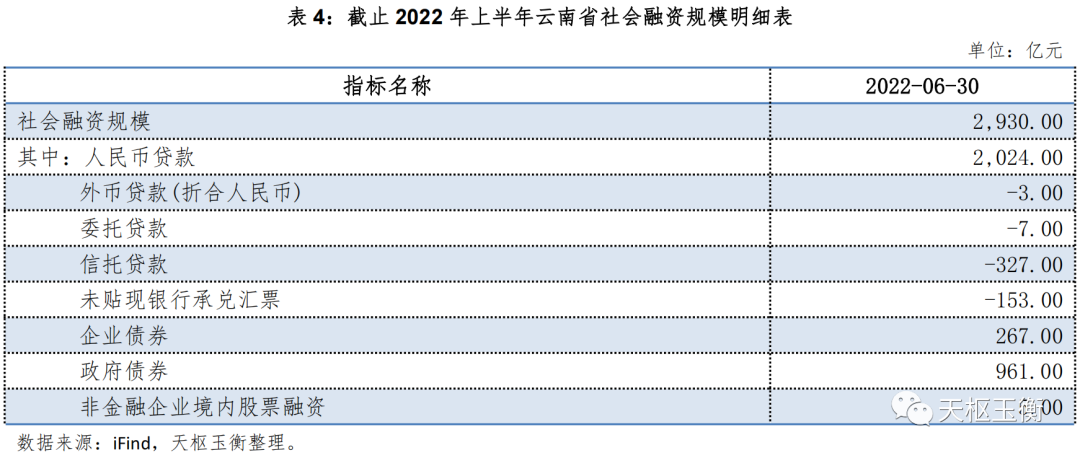 截止2022年上半年,云南省社會融資規(guī)模為2,930億元。其中:人民幣貸款2,024億元,政府債券961億元。