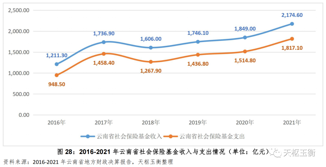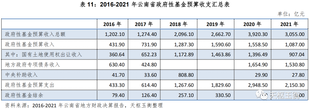 根據(jù)云南省地方財政決算報告披露,近六年來云南省一般公共預算支出總額,每兩年即有一個飛躍:2016-2017年政府性基金預算收入為1,000億級、2018-2019年為2,000億級、2020-2021年為3,000億級。