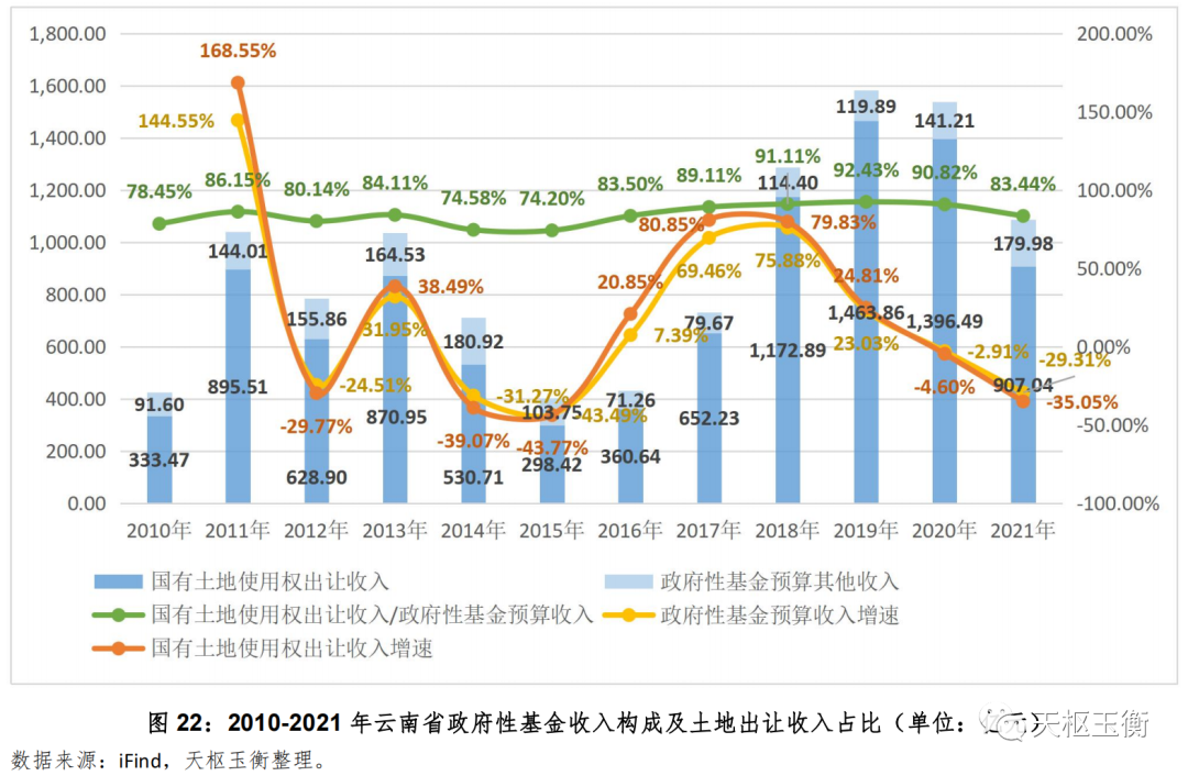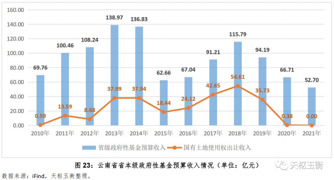 2021年云南省政府性基金收入較2020年下滑了30%,主要原因是2021年國有土地使用權(quán)出讓收入較2020年下滑了35%,土地出讓較為低迷。