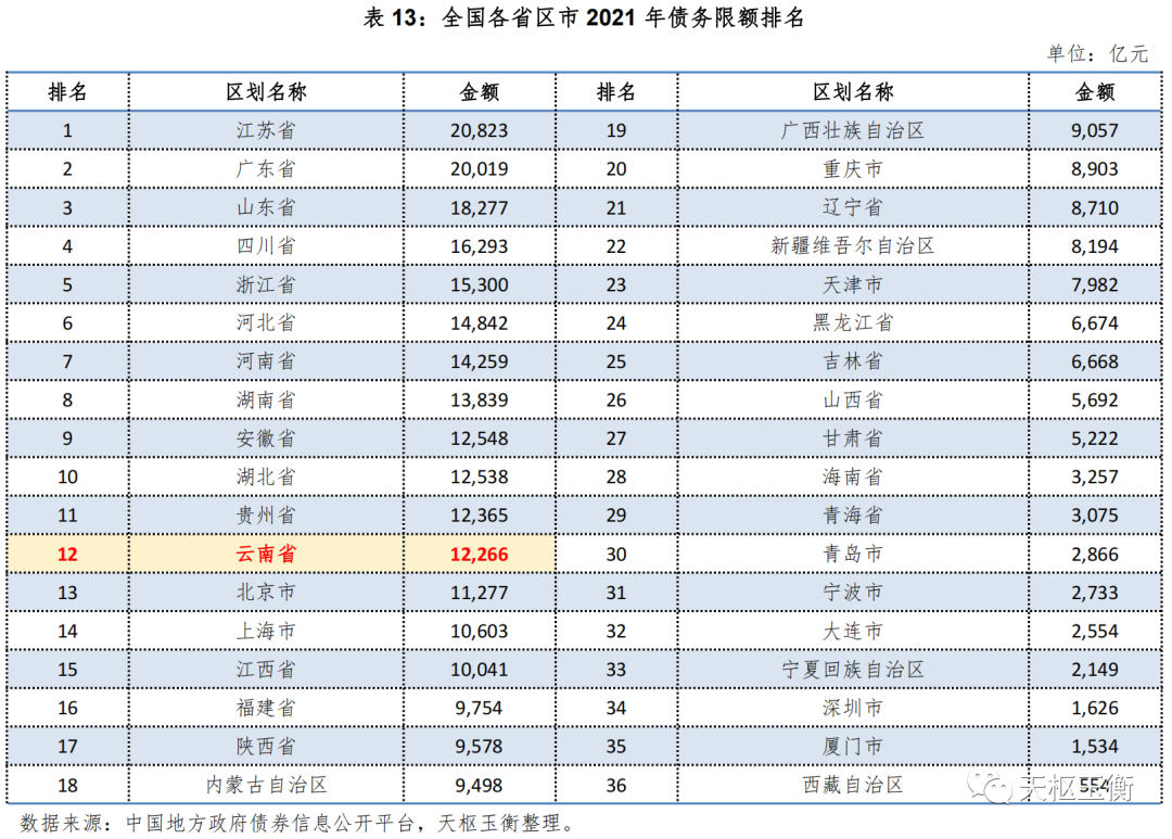 2021年,全國債務(wù)限額為33.27萬億元,其中,一般債務(wù)限額15.11萬億元,專項債務(wù)余額18.17萬億元。云南的地方政府債務(wù)限額為12,266億元,在全國各省區(qū)中,排名第12位,是15個限額超萬億的省市之一。