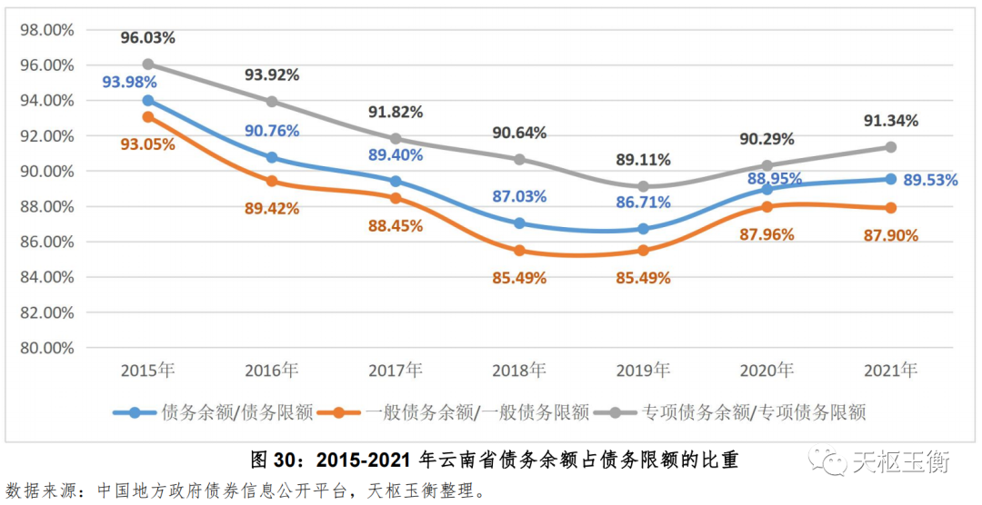 從債務(wù)余額的使用情況來看,云南省地方政府債務(wù)余額自2017年開始即未超過國家劃定的債務(wù)限額的90%,且呈現(xiàn)緩慢下降的態(tài)勢。