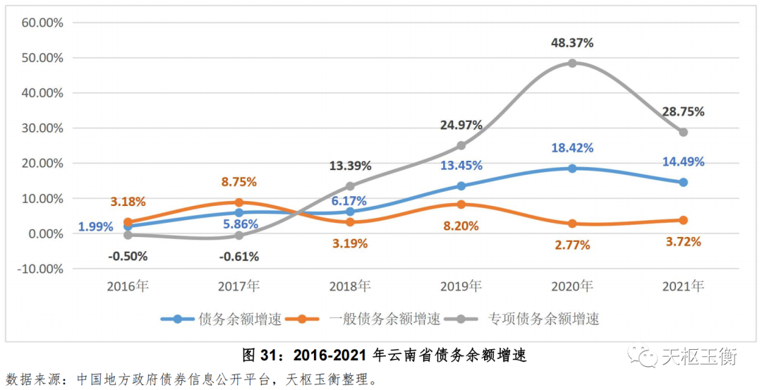 從債券余額的增速來看,近年來云南省專項債務(wù)的增速較為明顯,尤其在2020年一度增速接近50%;一般債務(wù)則保持較為緩慢的增長。