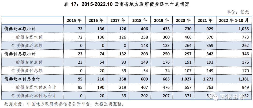 從還本付息來看,2020年云南省地方債券還本付息額首次突破千億,2021年云南省債券合計還本付息1,271億元,其中還本額929億元,付息額342億元;2022年1-10月云南省債券合計還本付息1,381億元,其中還本額1,035億元,付息額346億元。