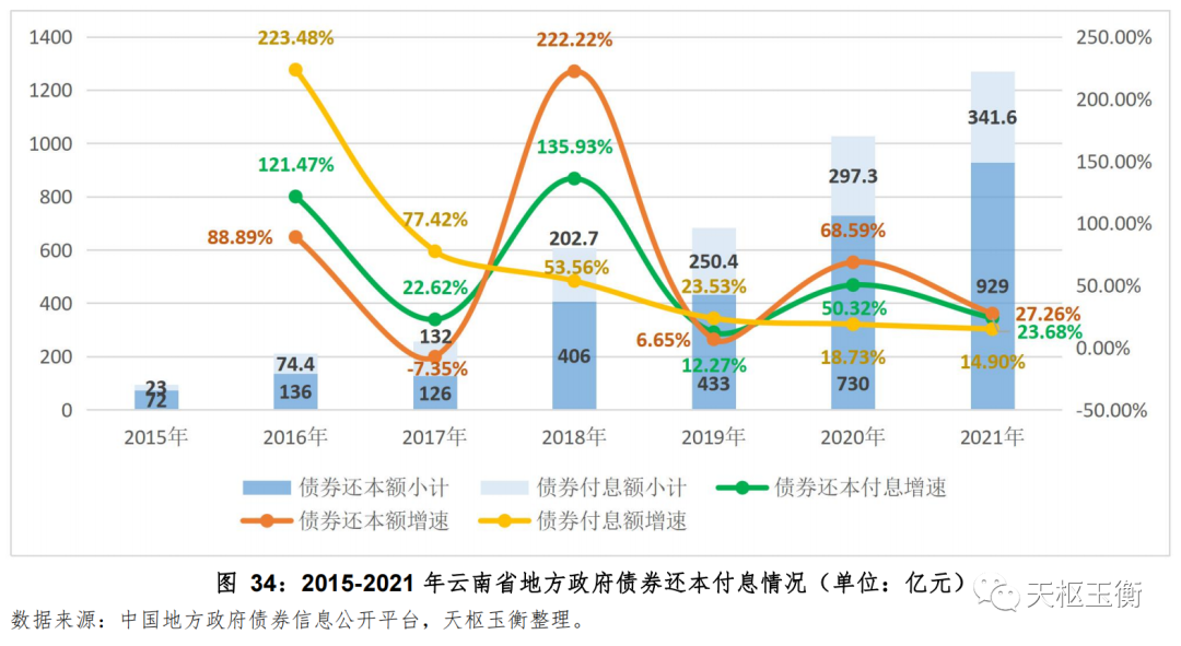 總體來看,云南省地方債券還本付息總額的增速與債券余額的增速基本保持一致,也呈現(xiàn)逐年放緩的態(tài)勢。