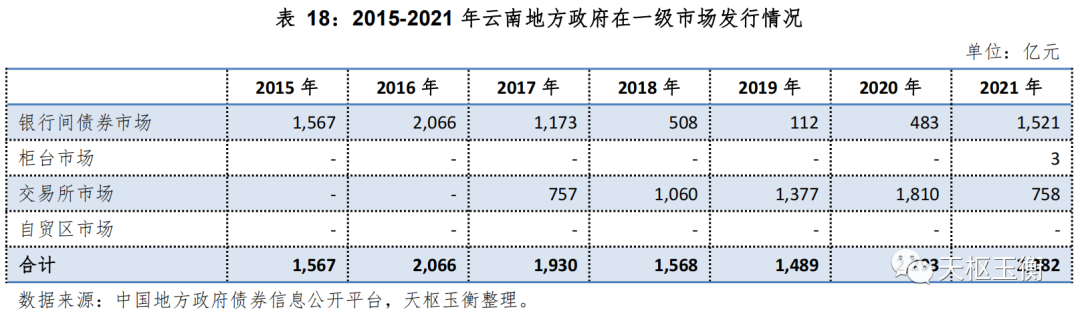 近年來,云南地方政府債券主要在銀行間債券市場和交易所市場發(fā)行,2021年在柜臺市場發(fā)行3億元,截止2021年末暫未在自貿(mào)區(qū)市場發(fā)行債券。
