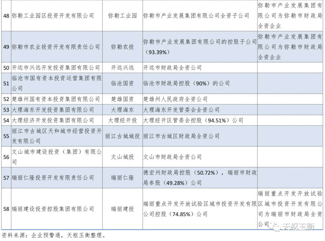 一是,本文所指云南省內(nèi)各投融資平臺公司,指由地方政府及其部門和機構(gòu)等通過財政撥款或注入土地、股權(quán)等資產(chǎn)設(shè)立,承擔政府投資項目融資功能,并擁有獨立法人資格的經(jīng)濟實體。包括各類綜合性投資公司,如建設(shè)投資公司、建設(shè)開發(fā)公司、投資開發(fā)公司、投資控股公司、投資發(fā)展公司、投資集團公司、國有資產(chǎn)運營公司、國有資本經(jīng)營管理中心等,以及行業(yè)性投資公司,如交通投資公司、土地開發(fā)投資公司等。