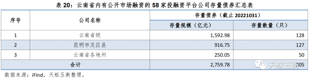 截止2022年10月31日,云南省、昆明市及云南各州市所屬投融資平臺公司共計58家企業(yè)有發(fā)行各類存量債券2759.78,有息債務(wù)金額合計22,357.76億元。