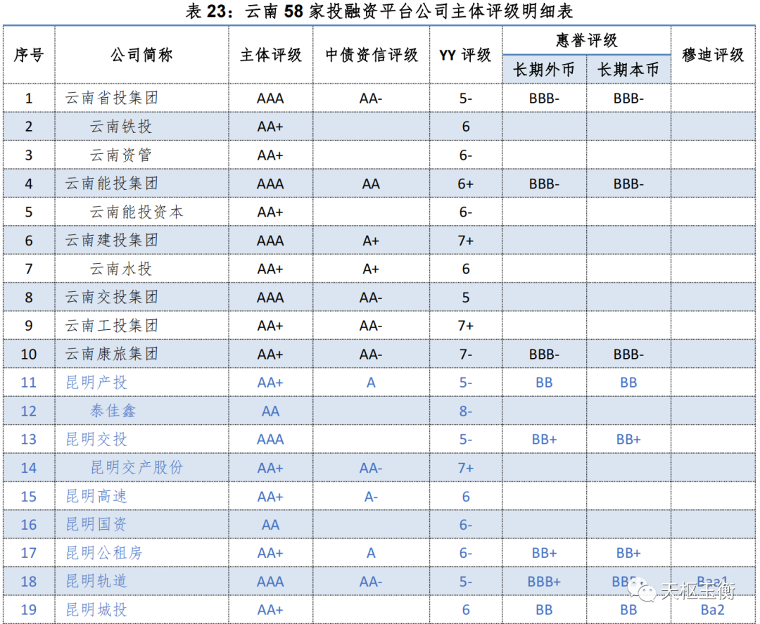 分層級來看:云南省級平臺公司主體評級均為AAA(4家)或AA+(6家);昆明市級及區(qū)縣級平臺公司中,AAA評級企業(yè)2家,AA+評級10家,AA評級8家;云南省地州級平臺公司中,2家企業(yè)主體評級為AA+,20家企業(yè)為AA,AA-企業(yè)4家,BBB-企業(yè)1家,另有1家企業(yè)系發(fā)行項目收益?zhèn)醋銎髽I(yè)主體評級。