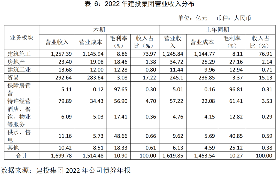 2022年建投集團(tuán)本部及合并范圍合計(jì)實(shí)現(xiàn)營業(yè)收入1699.78億元,其中建筑施工收入合計(jì)1257.39億元,占比73.97%,毛利率8.86%;另外貿(mào)易收入292.64億元,占比17.22%,毛利率低至3.08%。