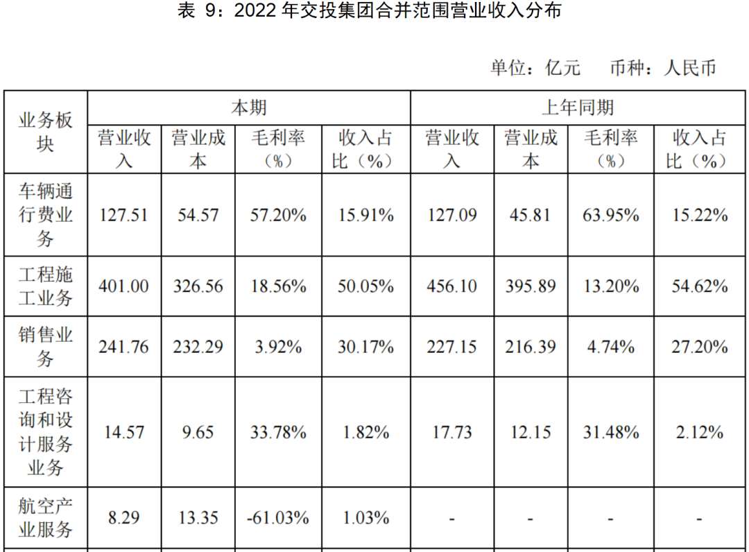 2022年交投集團(tuán)本部及合并范圍合計(jì)實(shí)現(xiàn)營業(yè)收入801.24億元,其中車輛通行費(fèi)收入127.51億元,占比15.91%,但毛利率高達(dá)57.20%;工程施工收入合計(jì)401億元,占比50.05%,毛利率18.56%;另外銷售收入241.76億元,占比30.17%,毛利率低至3.92%。