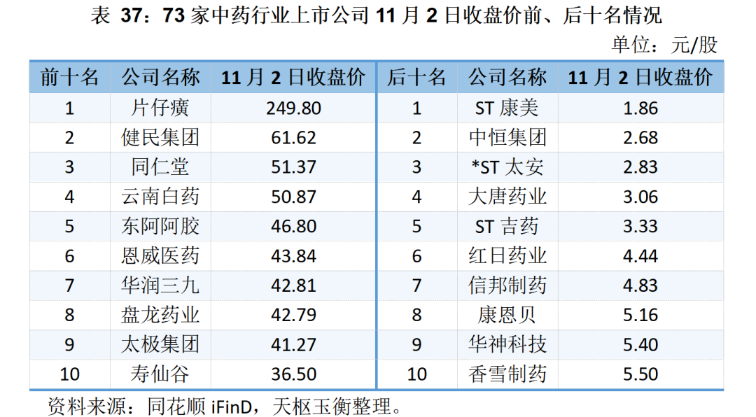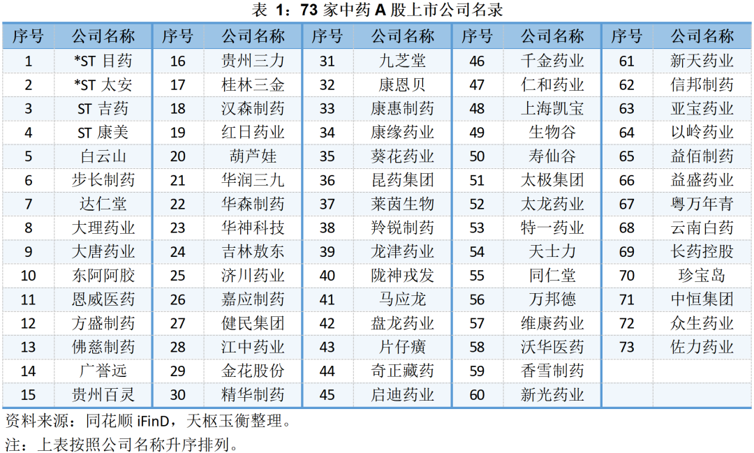 73家中藥上市公司的二級市場表現(xiàn)及市值明細如下所示: