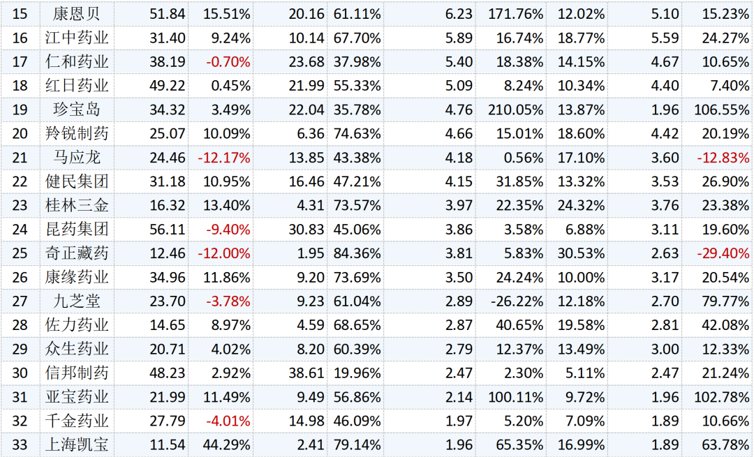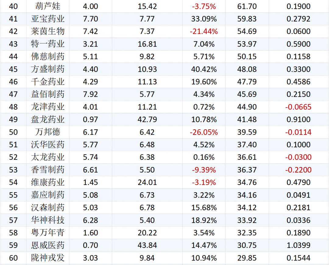 在收盤價方面,片仔癀是唯一股價破百的公司,截止11月2日收盤,片仔癀的收盤價為249.80元/股;健民集團以61.62元/股的收盤價位居第二,同仁堂、云南白藥分別以51.37元/股和50.87元/股緊隨其后;另有29家公司股價不足10元/股。