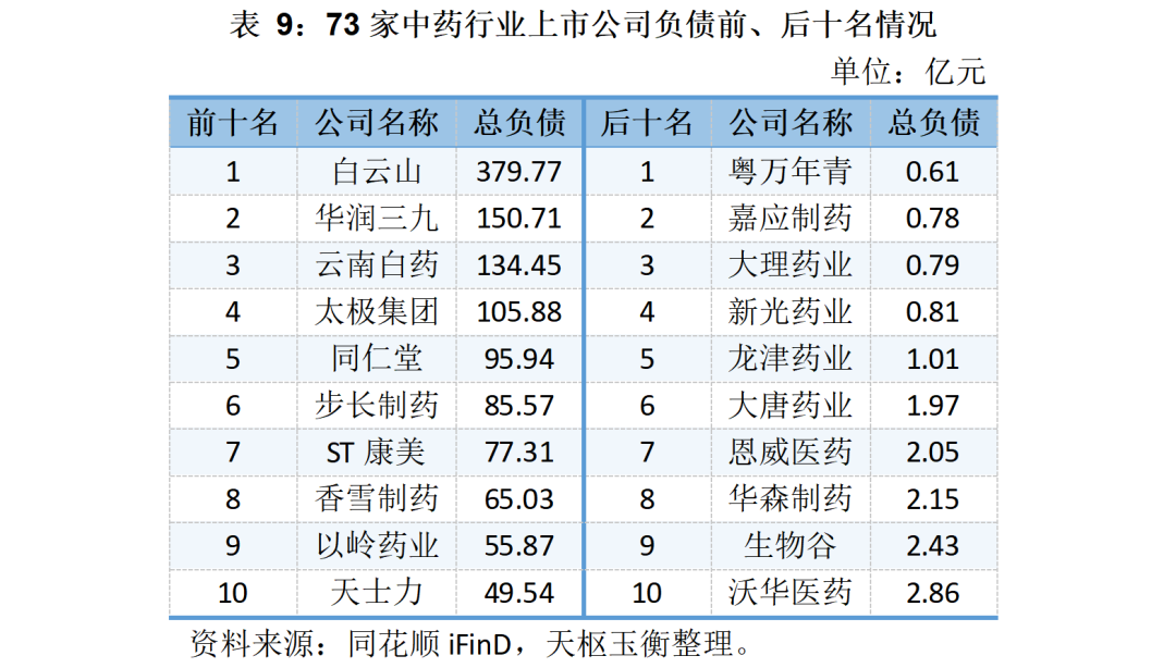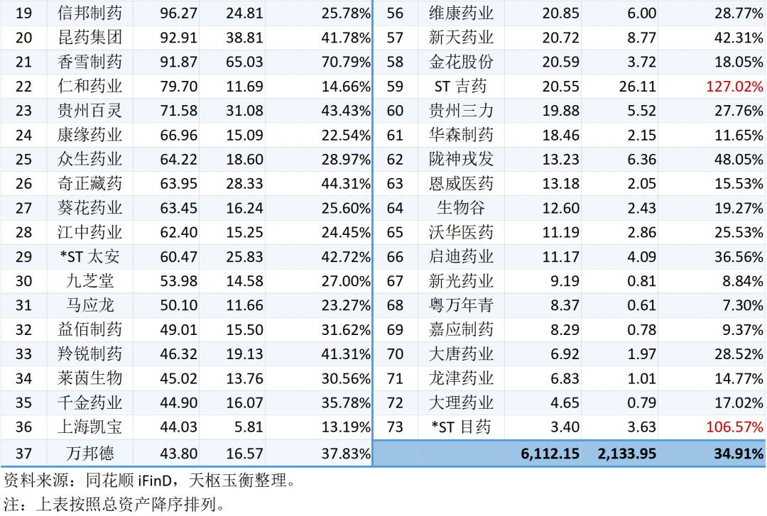 73家中藥上市公司的資產(chǎn)、負債與資產(chǎn)負債率明細表如下所示: