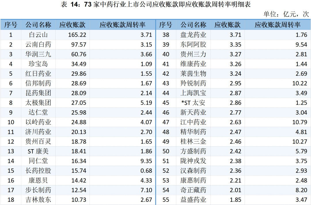73家中藥行業(yè)上市公司應收賬款及應收賬款周轉率明細表如下所示: