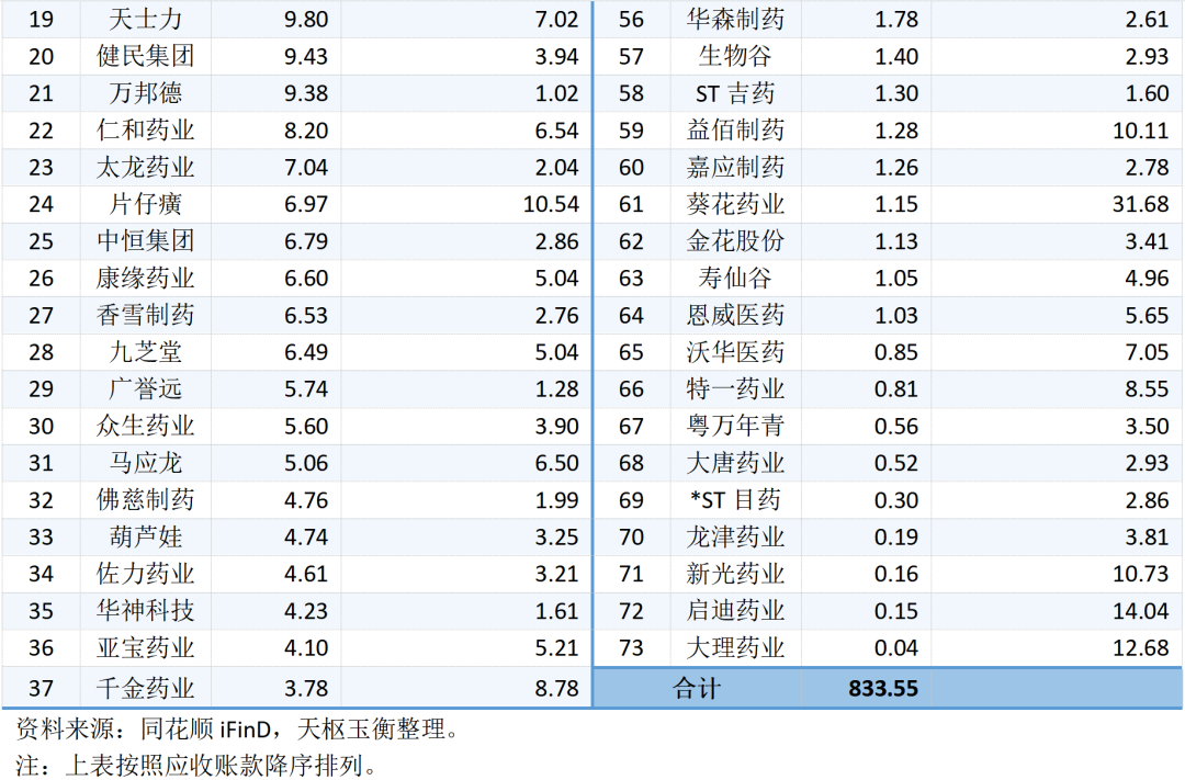 在應收賬款方面,截止2023年9月30日,73家中藥行業(yè)上市公司應收賬款總額為833.55億元,其中白云山的應收賬款余額為165.22億元,云南白藥97.57億元,華潤三九60.76億元。