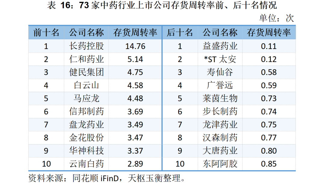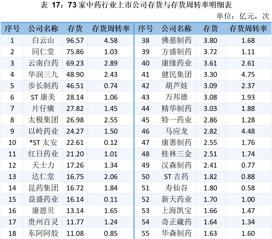 73家中藥行業(yè)上市公司存貨及存貨周轉率明細表如下所示:
