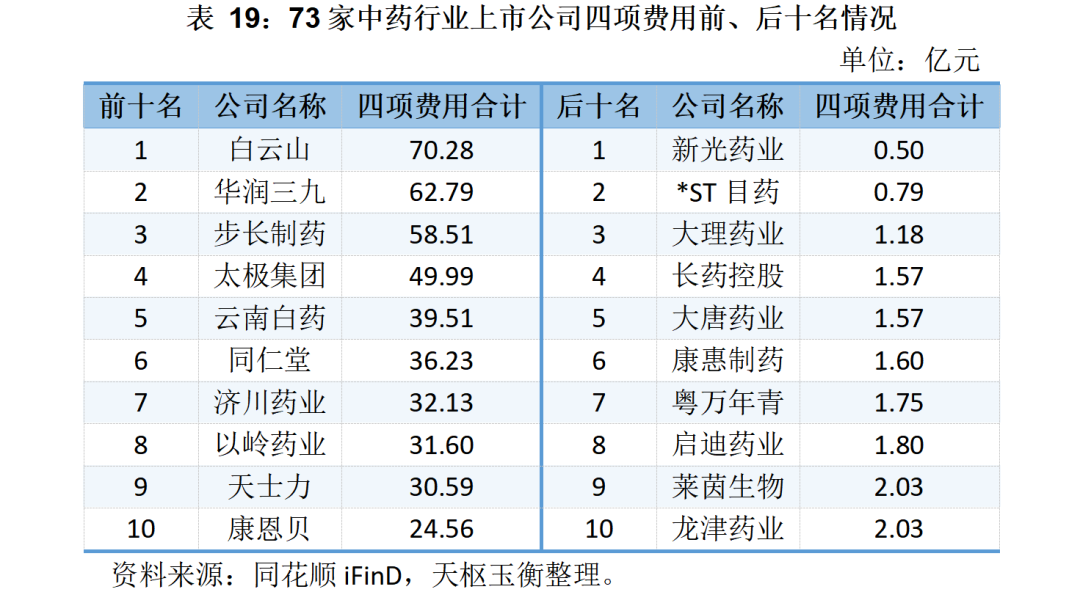 管理費用方面,僅白云山、同仁堂和華潤三九的管理費用破10億元,分別為17.72億元、10.85億元和10.40億元。