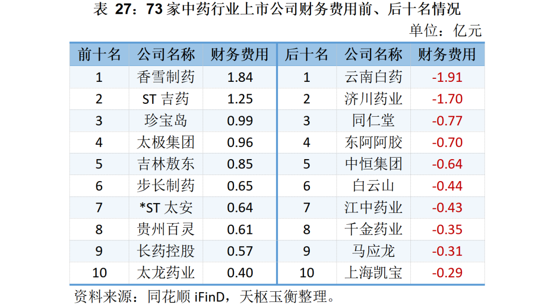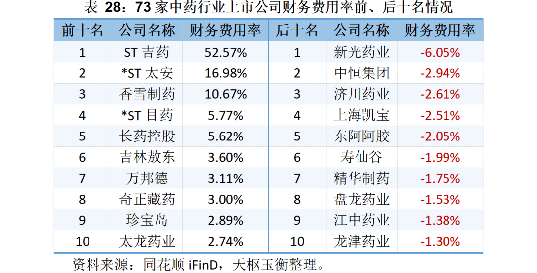 財務費用方面,僅香雪制藥和ST吉藥的財務費用在2023年前三季度突破億元;云南白藥和濟川藥業(yè)的財務費用則為-1.91億元和-1.70億元。