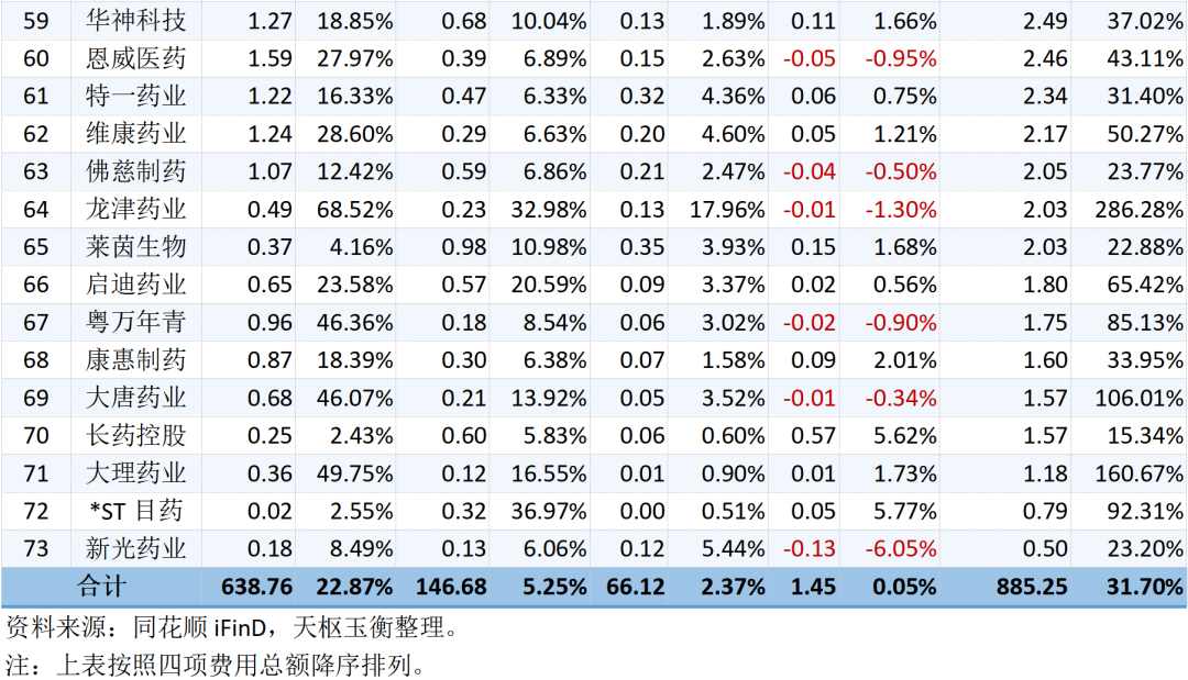 73家中藥上市公司的四項費用及費用率明細表如下所示: