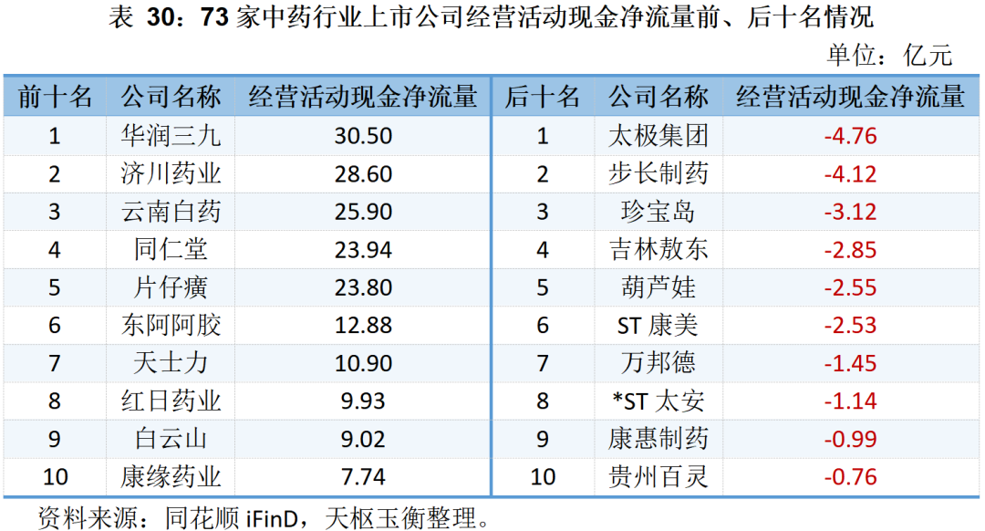 在經(jīng)營活動現(xiàn)金凈流量方面,51家中藥上市公司經(jīng)營活動現(xiàn)金凈流量為正,其中:華潤三九在2023年前三季度共實現(xiàn)30.50億元位居榜首;濟川藥業(yè)、云南白藥、同仁堂和片仔癀的經(jīng)營活動現(xiàn)金凈流量也均破20億元,分別為28.60億元、25.90億元、23.94億元和23.80億元。