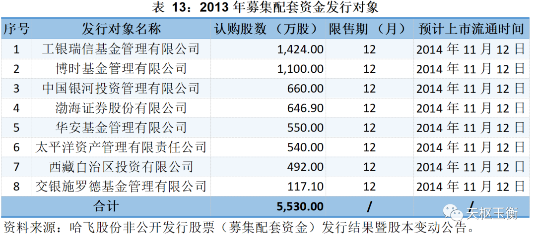 同時(shí),哈飛股份按照20.00元/股的價(jià)格,以非公開發(fā)行股票的方式向8名投資者發(fā)行股份55,300,000股募集配套資金11.06億元。