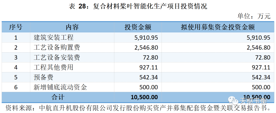 直升機(jī)復(fù)合材料構(gòu)件生產(chǎn)線擴(kuò)建項(xiàng)目總投資15,672萬元,其中:固定資產(chǎn)總投資11,000萬元,主要用于建筑工程費(fèi)3,209.72萬元、設(shè)備費(fèi)6,176.04萬元、設(shè)備安裝費(fèi)239.38