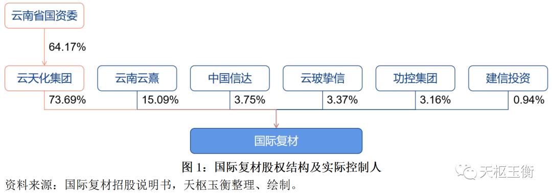 重慶國際復合材料股份有限公司成立于1991年8月27日,公司注冊資本30.71億元。國際復材首次公開發(fā)行股票并在創(chuàng)業(yè)板上市,按照2.66元/股發(fā)行新股70,000萬股(占發(fā)行后總股本18.56%),發(fā)行市盈率10.21倍,發(fā)行市凈率1.24倍,共計募集資金18.62億元,扣除相關發(fā)行費用后實際募集資金凈額169,656.57萬元。所募集資金將用于年產(chǎn)15萬噸ECT玻璃纖維智能制造生產(chǎn)線項目、F10B年產(chǎn)15萬噸高性能玻纖生產(chǎn)線冷修技改項目和高性能電子級玻璃纖維產(chǎn)品改造升級技術改造項目。截至目前,國際復材控股股東為云天化集團,公司實際控制人為云南省國資委,公司股權結構如下所示: