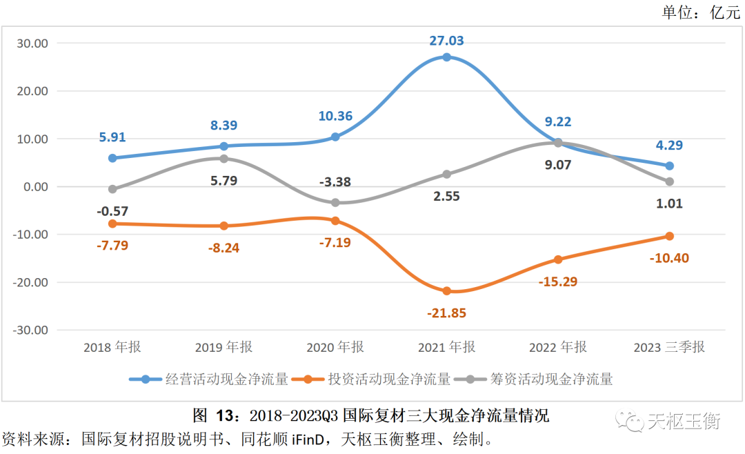 在經(jīng)營活動現(xiàn)金凈流量方面,2021年國際復材實現(xiàn)經(jīng)營活動現(xiàn)金凈流入27.03億元,達到近年來峰值;2023年前三季度,國際復材經(jīng)營活動現(xiàn)金凈流入4.29億元;