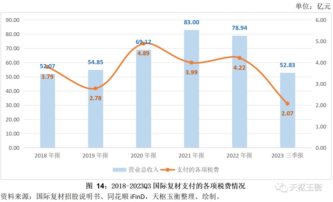 2018年至2023年三季度末,國際復材累計支付各項稅費21.74億元,各年支付情況如下圖所示: