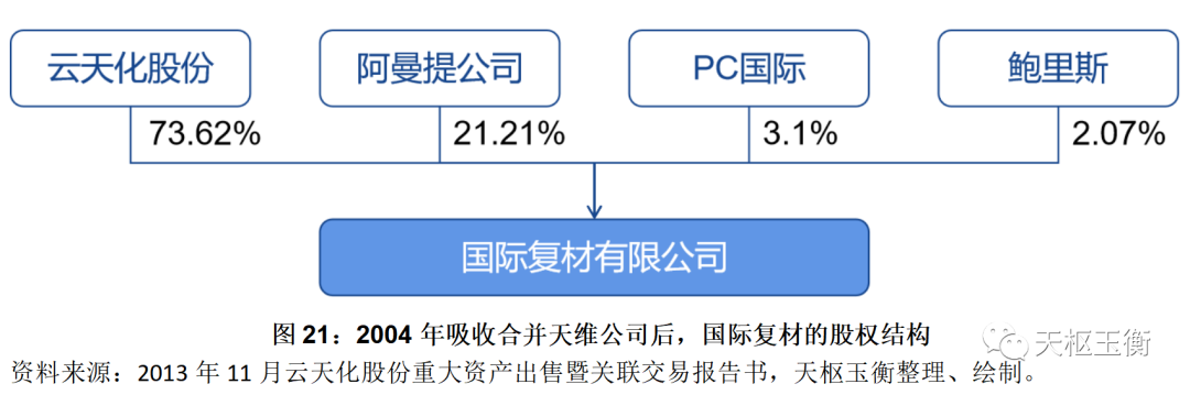 2004年6月13日,云天化股份召開董事會審議通過《關于重慶天維新材料有限公司以吸收合并方式并入重慶國際復合材料有限公司的特別議案》,同意國際復材吸收合并天維公司,并于2004年11月完成合并。吸收合并完成后,天維公司解散,法人資格注銷,合并后的國際復材作為唯一存續(xù)的法律主體,享有和承擔天維公司的全部資產(chǎn)、負債和權益。合并后國際復材的注冊資本為6,388萬美元,云天化股份的的持股比例上升至73.62%。