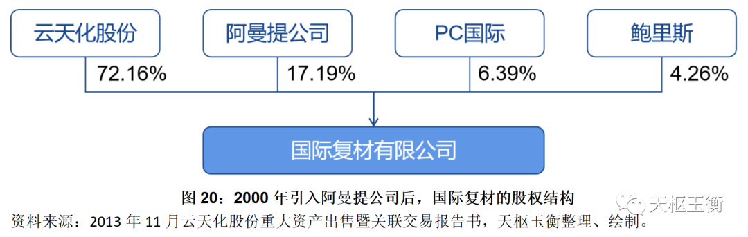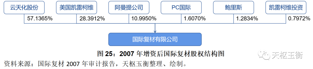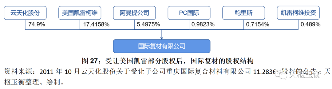 2012年5月,云天化股份受讓凱雷柯維有限公司和凱雷柯維共同投資有限公司持有國際復材17.9048%股權,交易價格為907,628,868.26元人民幣。至此,美國凱雷柯維及凱雷柯維投資不再持有國際復材的股權。