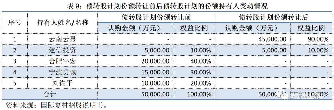 2022年9月2日,除建信投資之外的債轉(zhuǎn)股計劃份額持有人將其持有的債轉(zhuǎn)股計劃份額轉(zhuǎn)讓給云南云熹。其中:合肥宇宏將其持有的債轉(zhuǎn)股計劃20,000萬元的份額以20,000萬元的價格轉(zhuǎn)讓給云南云熹;寧波勇誠將其持有的債轉(zhuǎn)股計劃15,000萬元的份額以15,000萬元的價格轉(zhuǎn)讓給云南云熹;劉佐平將其持有的債轉(zhuǎn)股計劃10,000萬元的份額以10,000萬元的價格轉(zhuǎn)讓給云南云熹。